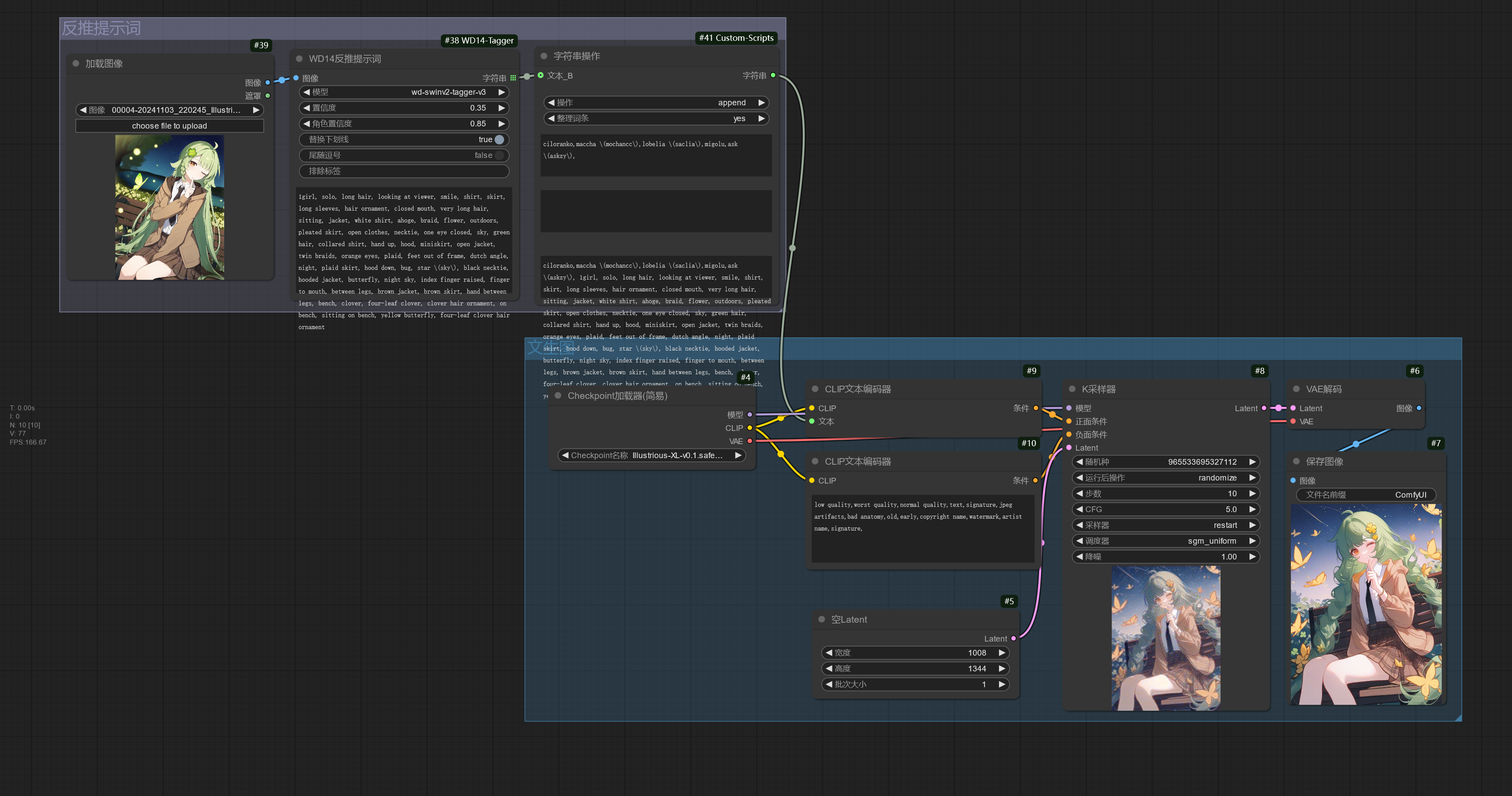 下面的工作流使用 ComfyUI-WD14-Tagger 扩展提供的节点反推提示词,再使用 ComfyUI-Custom-Scripts 扩展提供的节点在反推出来的提示词上附加其他提示词。