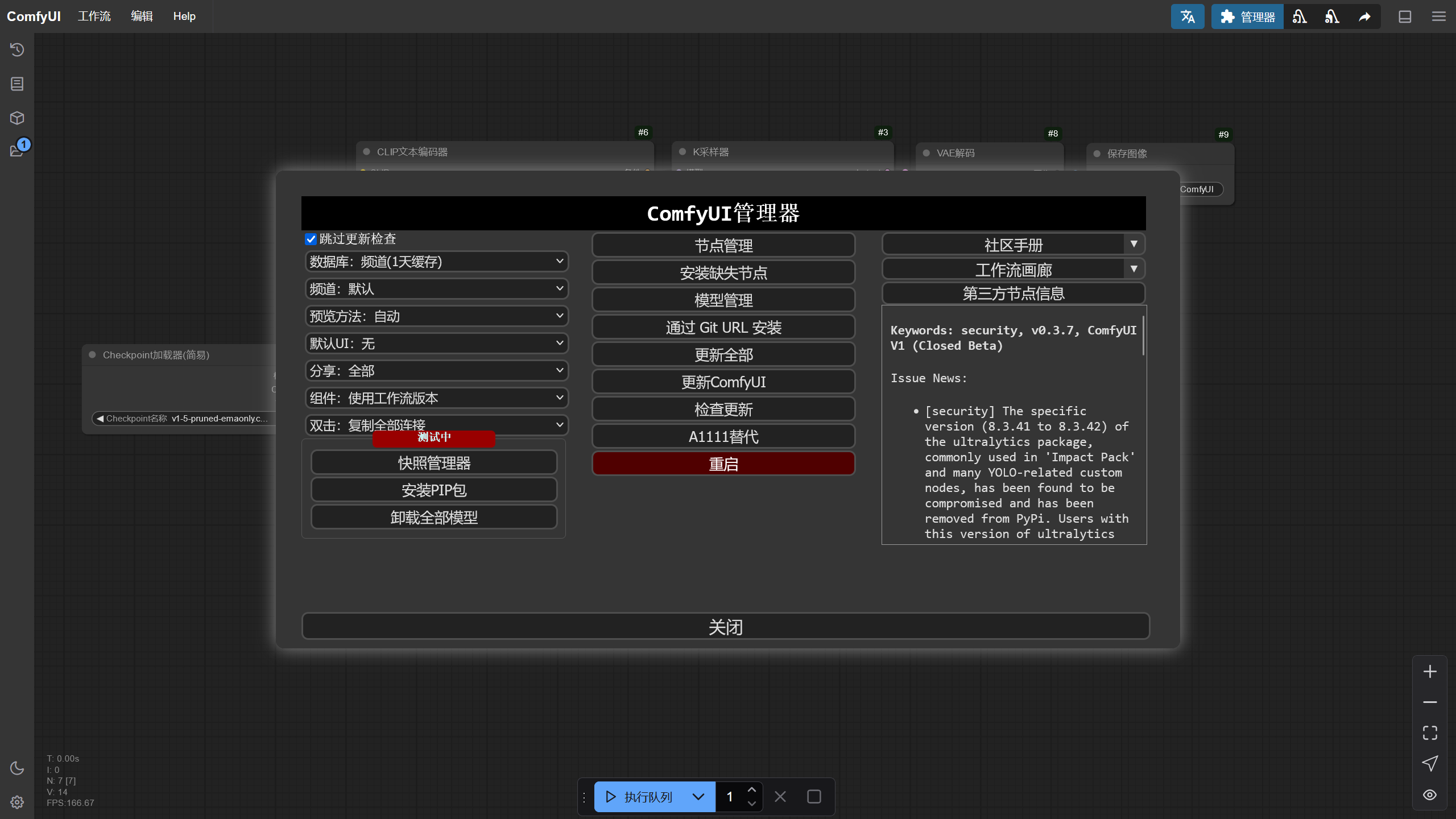 安装后重新启动 ComfyUI,如果在 ComfyUI 界面顶部可以看到 Manager 按钮,说明 ComfyUI-Manager 已经成功安装。