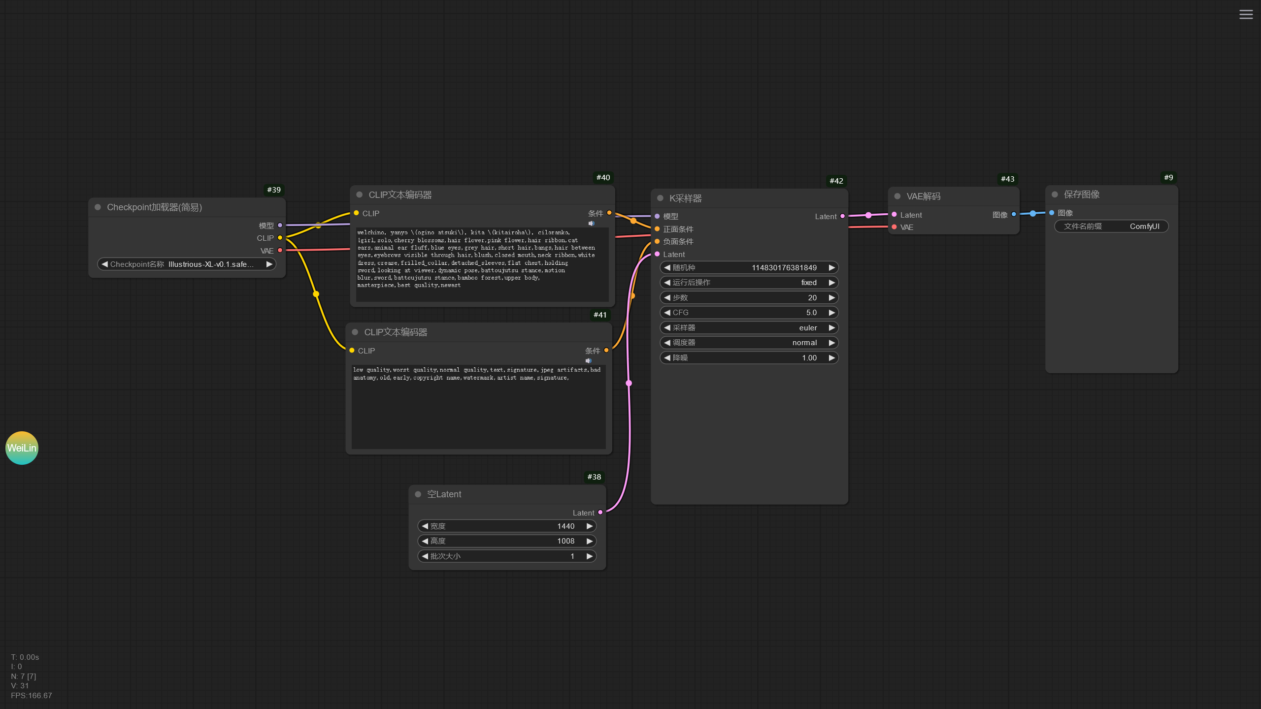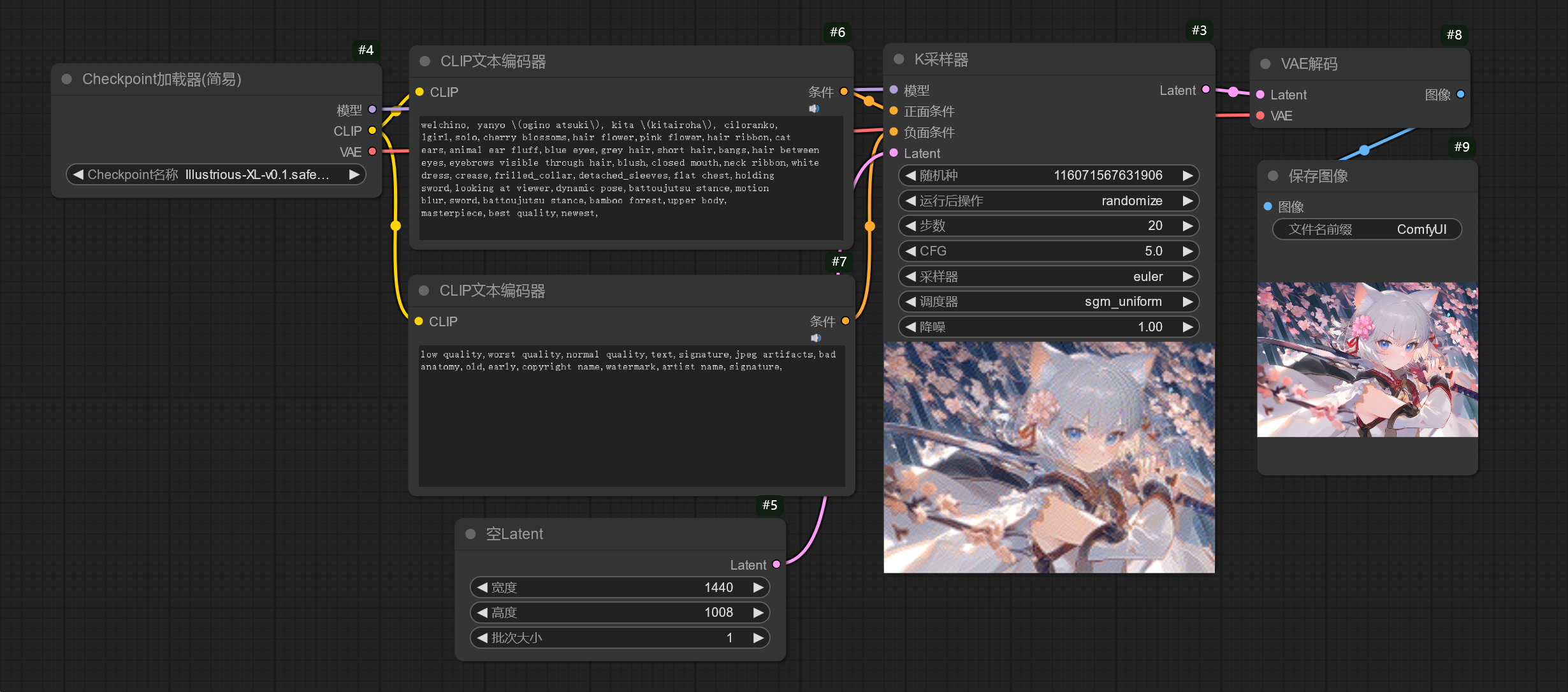下面是一个简单的生图工作流,可以看到该工作流有许多节点组成。