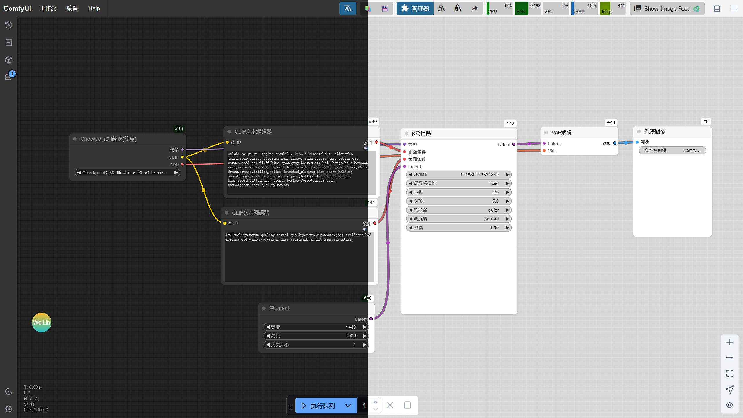 ComfyUI 的界面和 Stable Diffusion WebUI 的界面完全不相同,在 ComfyUI 中,每个功能都被拆散成一个个节点,通过连接不同的节点搭建起一个完整的生图流程。