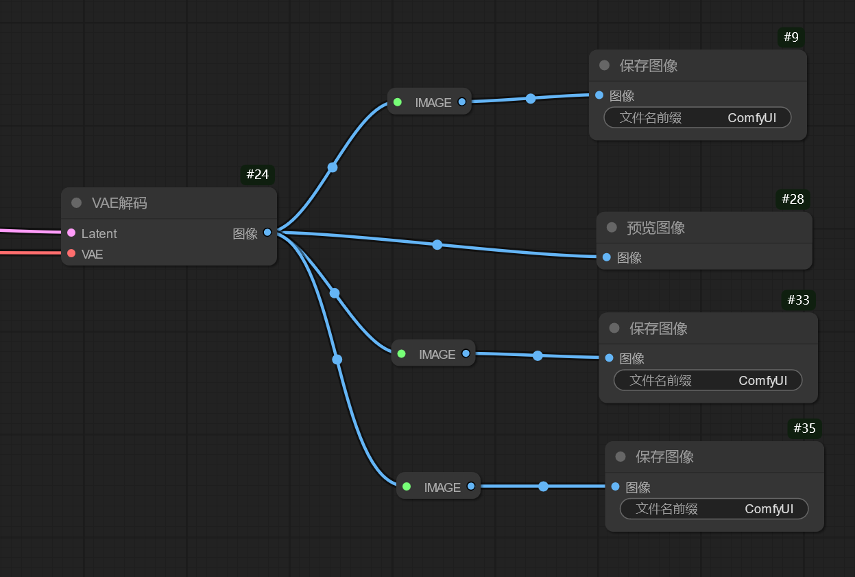 节点之间连线可以通过按住节点的接口拉出一条线,将线连接到另一个节点上。如果一个节点的输出想要拉出两条线,除了从接口分别拉出两条线这个方法,还可以在有一条线的基础上,按住 Shift 键并点击那条线,此时将快速从该线的端点快速拉出一条线,而不是必须从输出接口拉线。