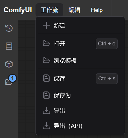 | 作用 | 显示关于工作流的操作。 | 显示编辑工作流的功能。 | 获取 ComfyUI 帮助。 | 显示 ComfyUI 运行日志。 | 隐藏 / 显示 ComfyUI 工具栏。 |