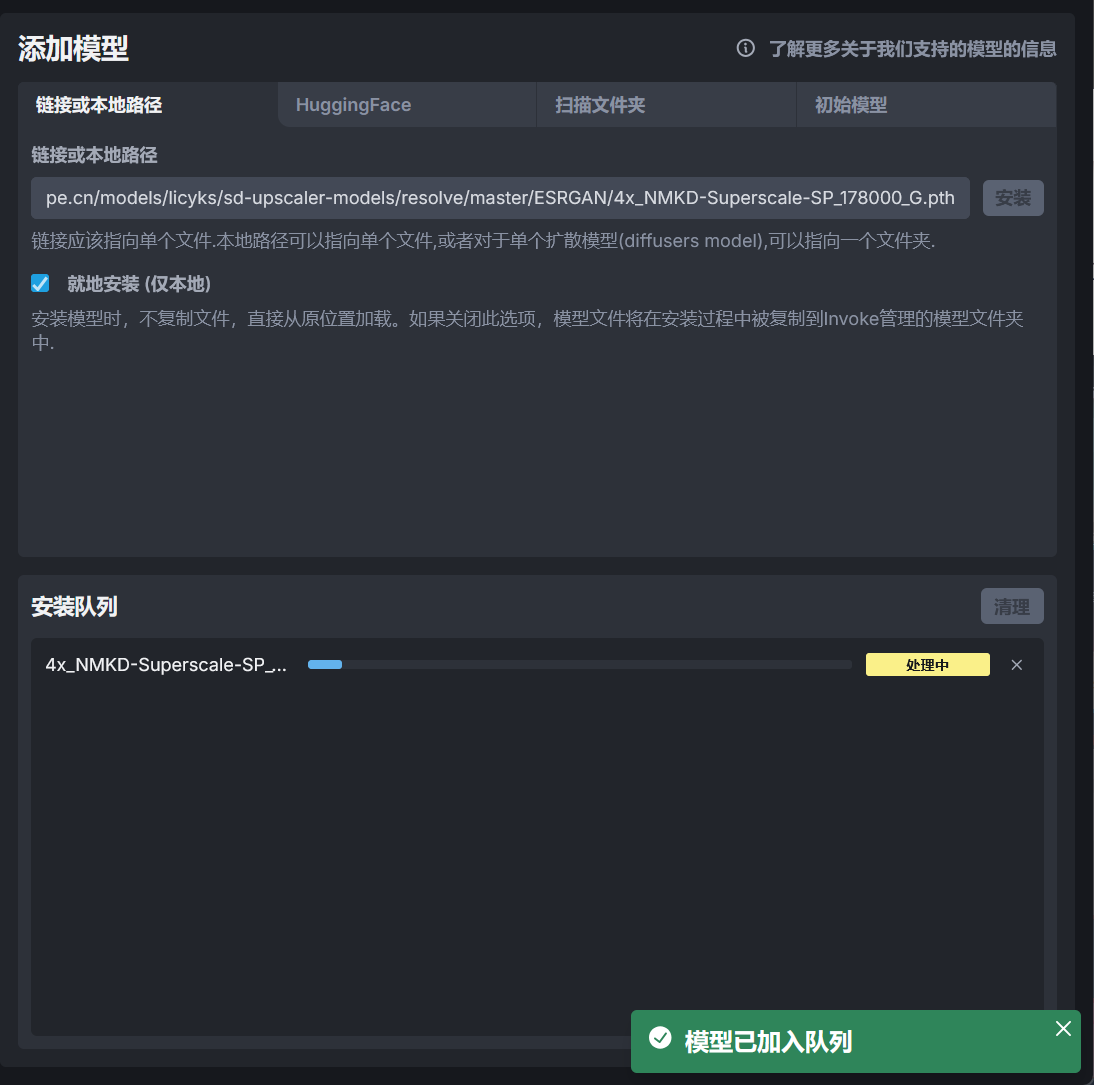 在链接或本地路径选项支持使用模型的下载链接或者模型的本地路径添加模型到 InvokeAI 中,如果使用链接下载模型,请确保模型的下载链接为直链。