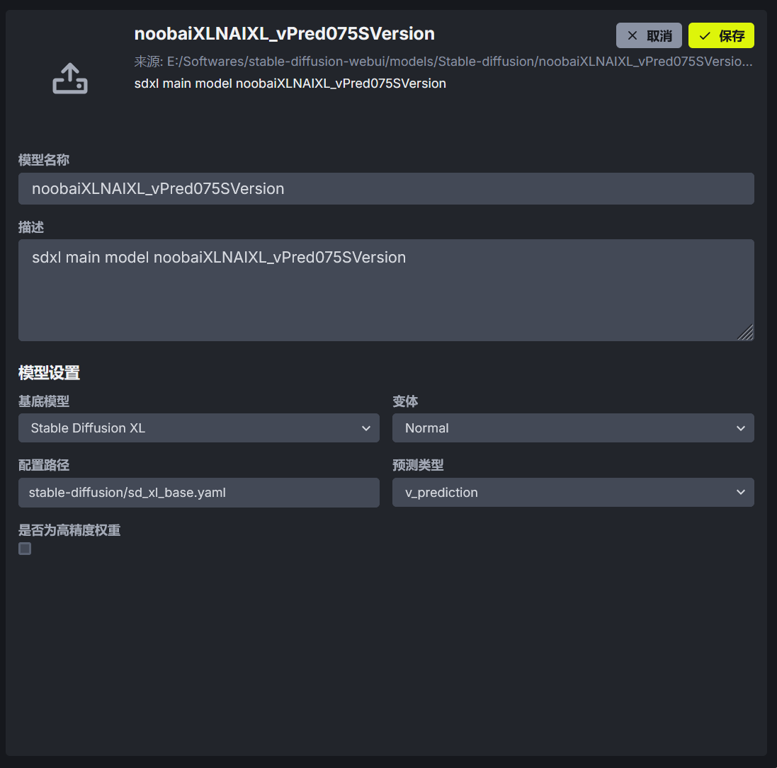 编辑按钮可以编辑模型的配置。部分模型需要修改模型配置才能正常使用,比如 NoobAI-XL 模型的 V 预测版本,需要将模型的预测类型修改为 v_prediction。