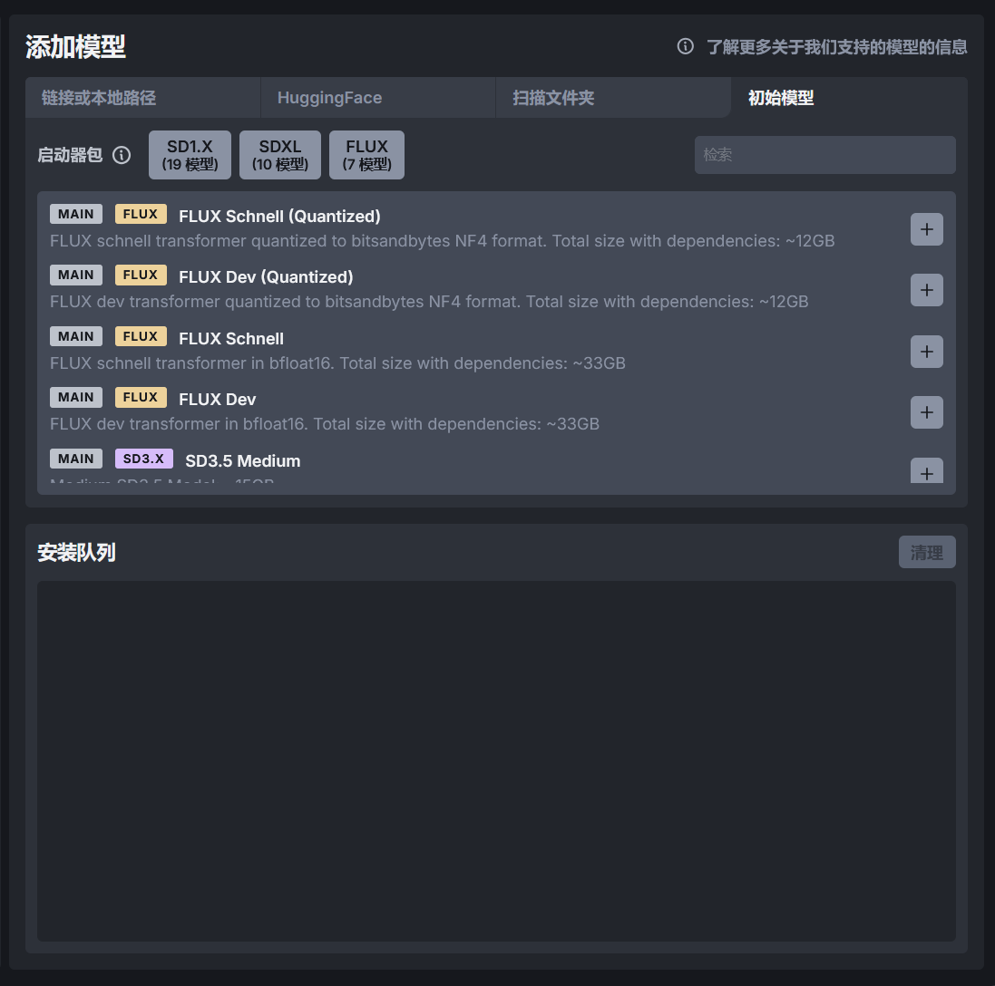 在初始模型选项包含了一些常用的模型,比如大模型、放大模型、ControlNet 模型、IP Adapter 模型等,根据自己的需求下载即可。