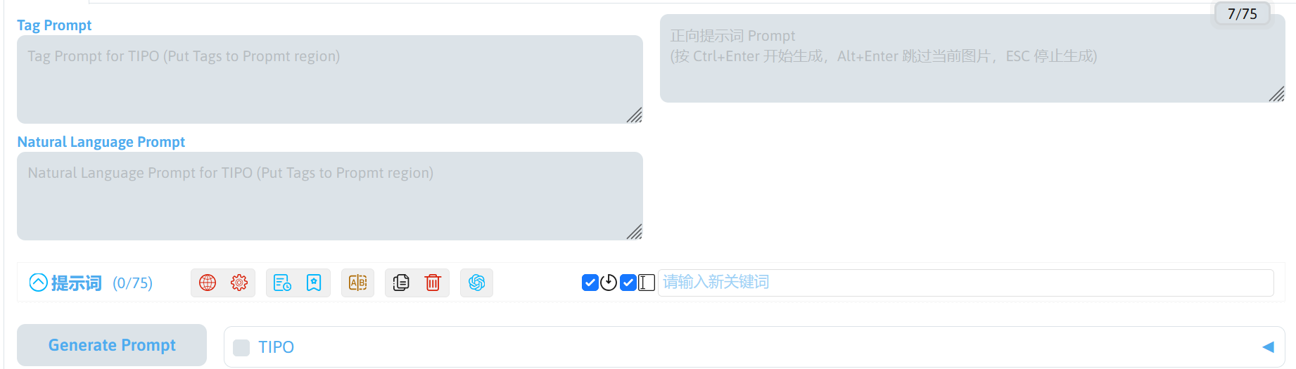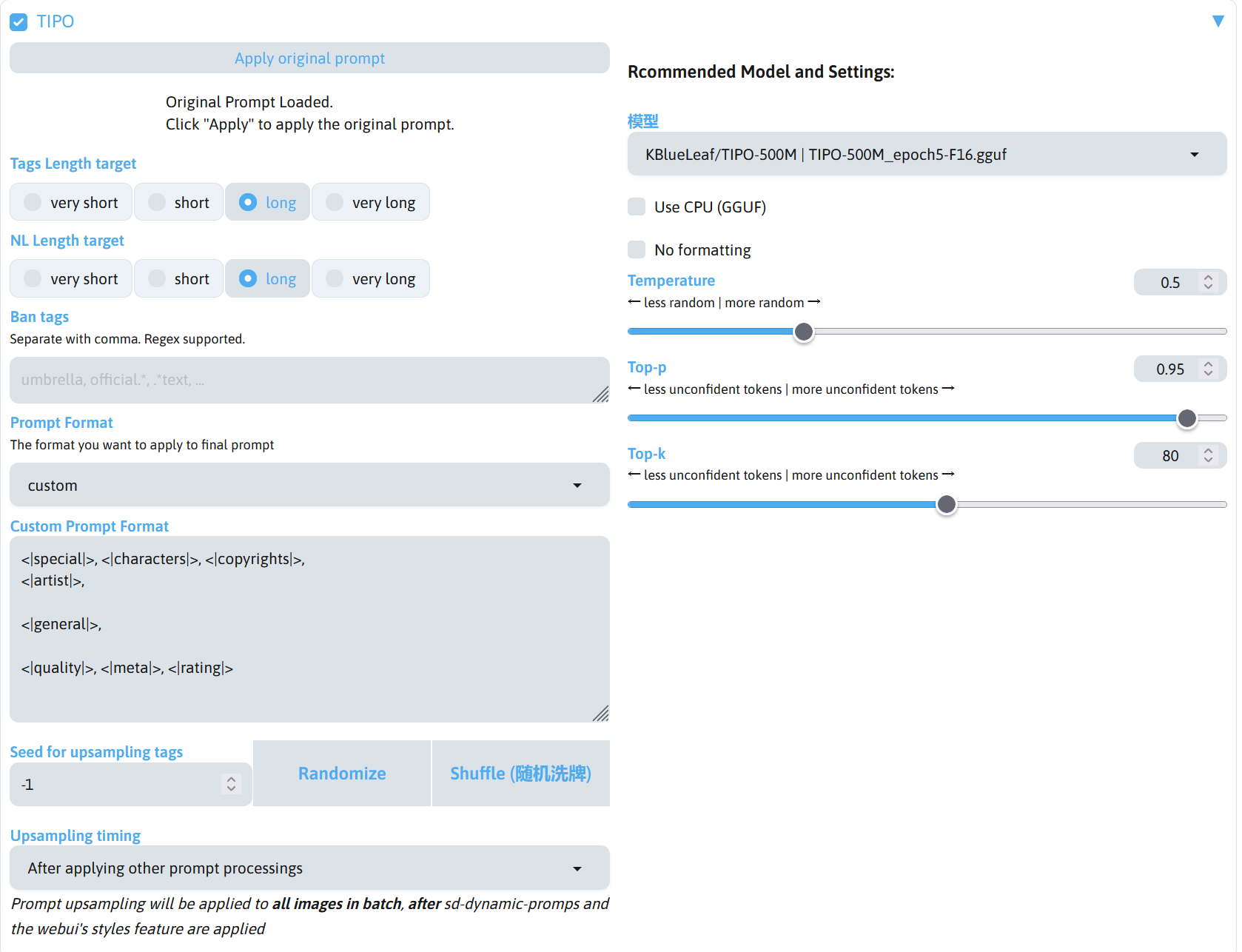 | Prompt Format | 调整 TIPO 生成提示词的格式。 |