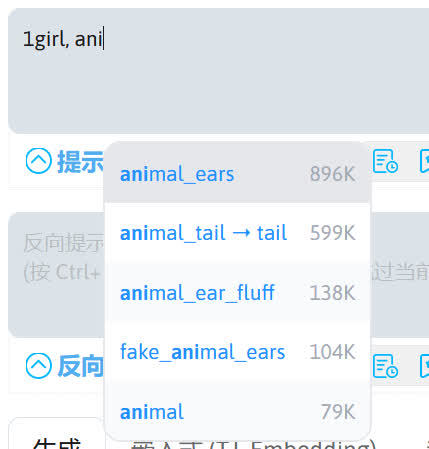 在正面提示词中输入你想要 AI 生成的东西(必须是英文),这里我们可以利用 a1111-sd-webui-tagcomplete 扩展来辅助我们输入提示词。使用方向键选择要补全的提示词,Tab 键 / Enter 键补全提示词。