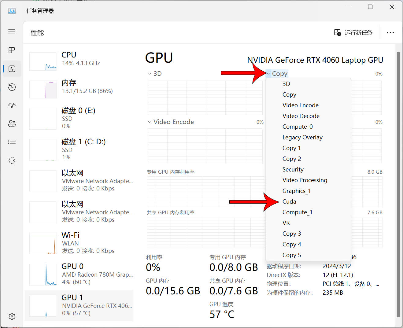 使用 Nvidia 显卡跑图时,任务管理器显示的显卡占用信息并不准确,这时需要将占用信息显示改成 CUDA。