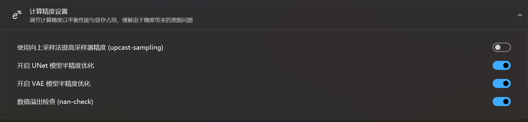 如果在跑图时经常报错提示在 UNet / VAE 中出现 NaN,可以选择关闭对应的模型半精度优化来缓解,但这可能会大大增加显存的占用量,出图的速度也会降低。通常通过更换模型来解决 NaN 更好。