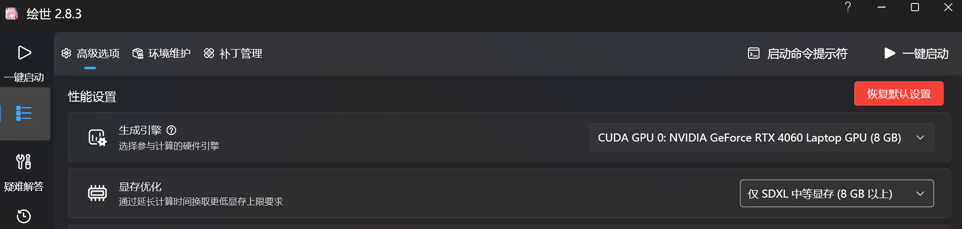 如果你是整合包用户,非必要情况下请勿使用启动器的 高级 / 专家 模式。如有必要,请务必在调整设定前记录好原本设定的值(除非您的 SD WebUI 已无法正常使用)。