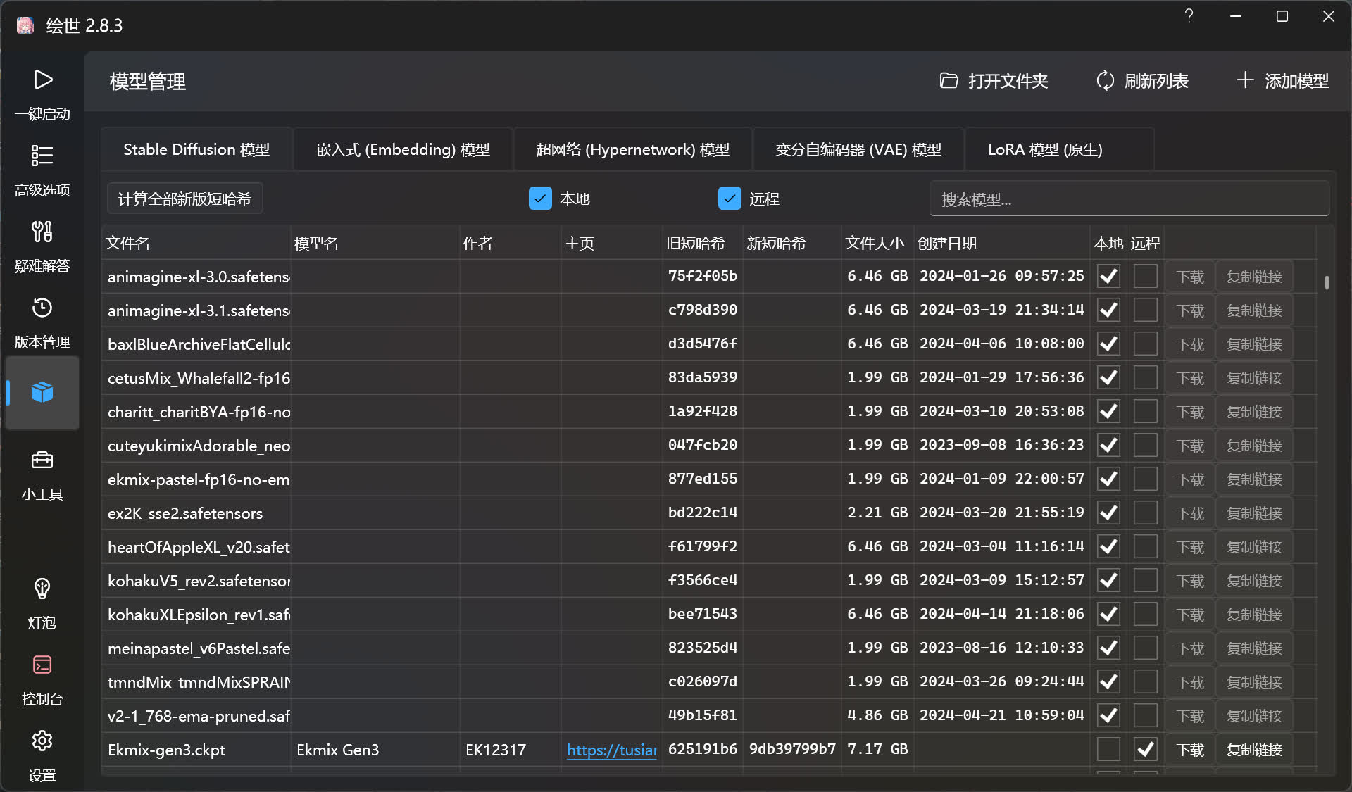 模型管理☍ 用于管理 SD WebUI 的模型。 这里列出了不同的种类的模型。 点击右上角的打开文件夹可进入模型存放的文件夹,点击添加模型可以将从别的地方下载的模型添加到 SD WebUI 的模型目录中。 这里分为本地和远程两种模型,本地即为存在 SD WebUI 模型文件夹中的模型,而远程为在绘世启动器模型托管服务器中可以下载的模型。